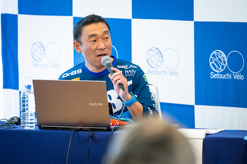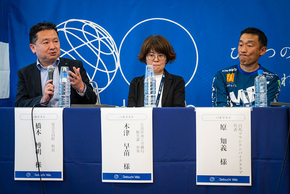 トライアルライド後に行われたミーティングでは、最初に安芸太田町町長の橋本博明氏が来場者への歓迎の言葉を述べるとともに、町の観光施策におけるサイクルツーリズムの重要性について語った。町は山林に囲まれた自然豊かな環境にあり、この資源を生かした地域活性化を目指している。観光を「見るだけ」で終わらせず、体験型の滞在を促すことで、地域への経済波及効果を高めていく方針である。