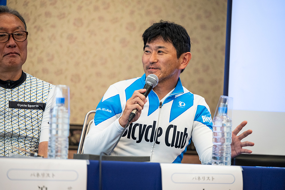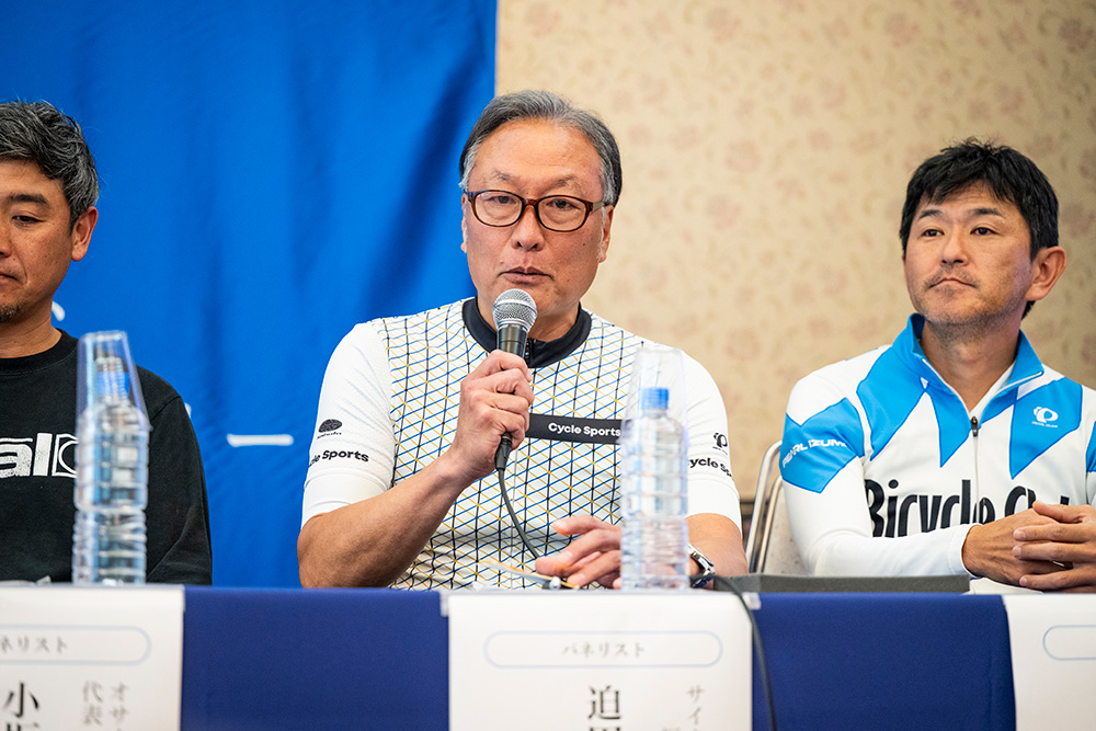 ミーティングの締めくくりとして行われたのは、パネルディスカッション。進行役は前出の門田氏が務め、パネリストとして橋本氏、木津氏、原氏の3名、さらに、オサカナ農園自然学校代表の小坂利隆氏、サイクルスポーツ編集部 統括編集長の迫田賢一氏、バイシクルクラブ編集部 編集長の山口博久氏も加わり、地域関係者と専門家が「自転車の可能性と展望」について意見を交わした。