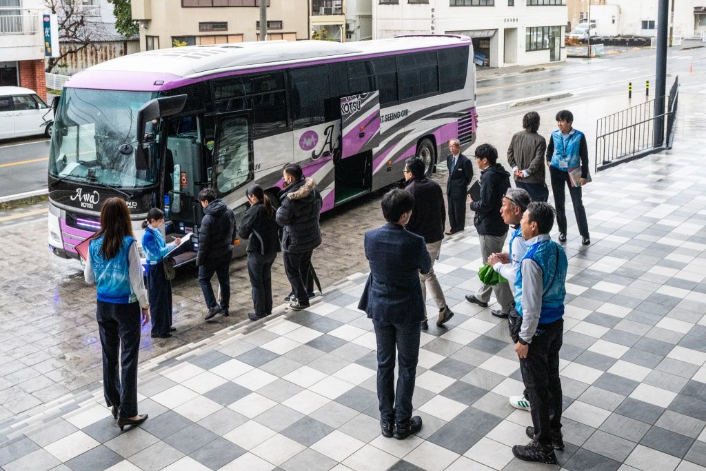 出発前には吉野川市長 原井敬氏が挨拶に立ち、県内外からの参加者への歓迎と感謝を述べた。吉野川市は徳島県中央部に位置し、一級河川・吉野川と四国山地、讃岐山脈に囲まれた自然豊かな地域であることを紹介。「本来は自転車で走って体感していただきたかったが、今日は視察という形で吉野川市の魅力を感じてほしい」と語った。