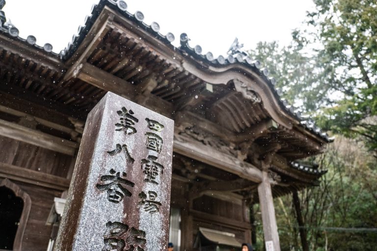 バスはまず四国八十八ヶ所第八番札所・熊谷寺へ向かい、遍路文化が根付く土地であることを確認。その後、阿波麻植大橋から学島橋(潜水橋)を車窓視察し、ひまわり農産市鴨島店へと向かった。