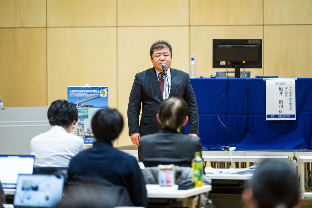 はじめに登壇したのは、吉野川市 商工観光課 課長補佐 原井慎司氏。2024年度から本格始動した「自転車を活用したまちづくり」の取り組みが報告された。柱は大きく四つ。①ヒルクライムレースの開催、②サイクルツーリズムの推進、③受入環境整備、④市民向けの安全・健康施策である。