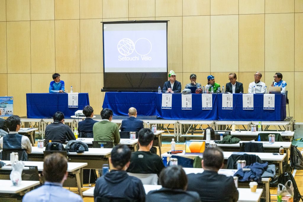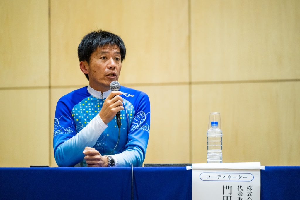 コーディネーターを務めたのは門田氏。パネリストには原井市長、眞鍋氏、矢部教授、に加え(一社)イーストとくしま観光推進機構専務理事 渡辺隆仁氏、サイクルスポーツ編集部 迫田賢一氏、バイシクルクラブ編集部 東宏祐氏が登壇し、それぞれの立場から議論が展開された。